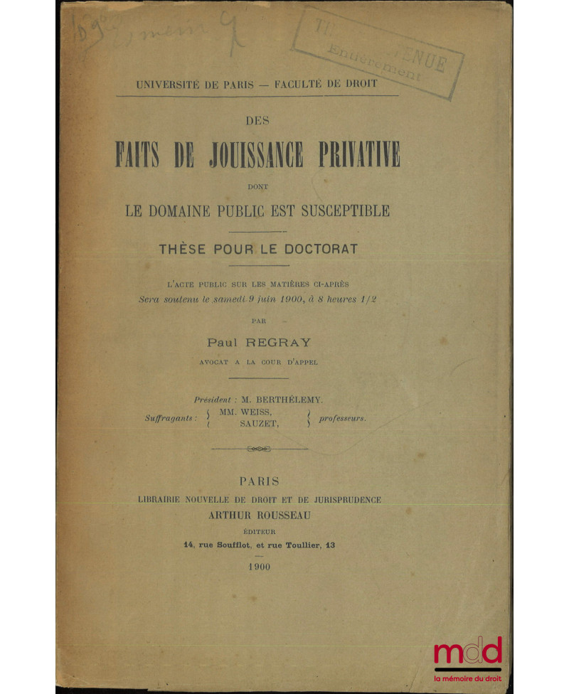 DES FAITS DE JOUISSANCE PRIVATIVE DONT LE DOMAINE PUBLIC EST SUSCEPTIBLE, Thèse (Président : M. Berthélemy ; Suffragants : MM. Weiss, Sauzet),...