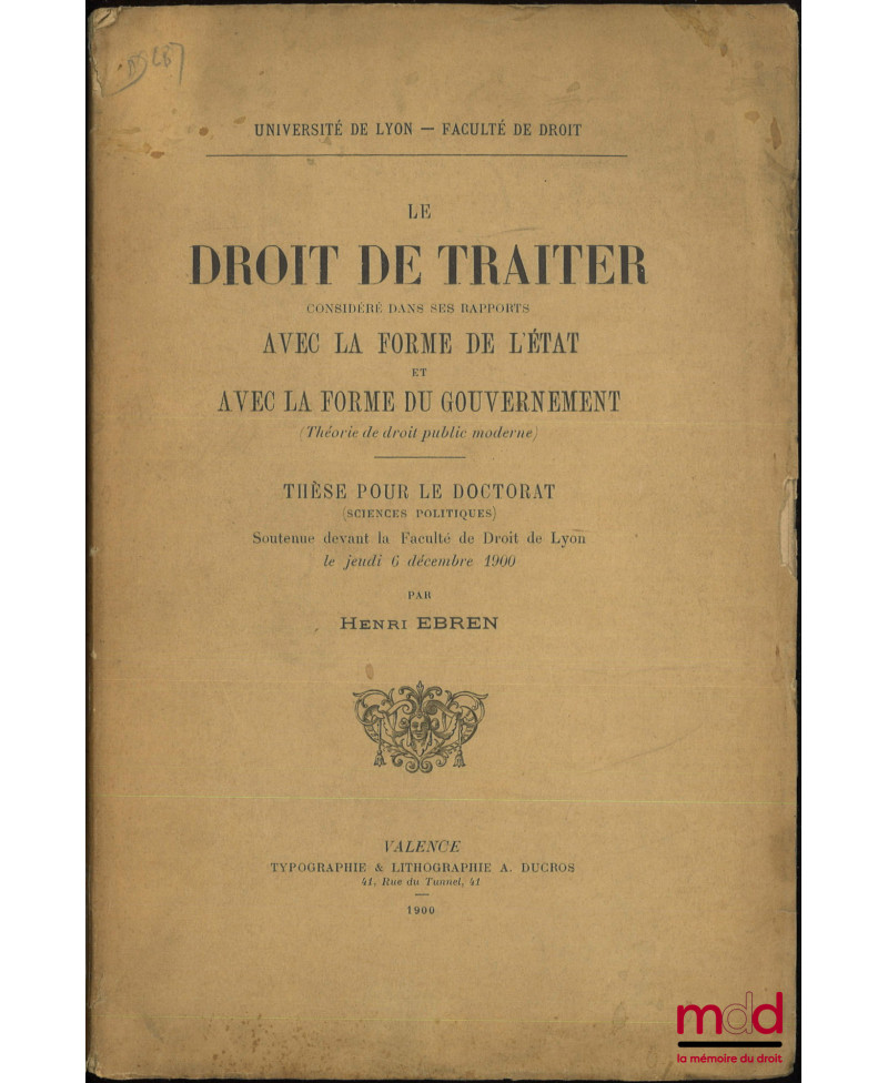 LE DROIT DE TRAITER, Considéré dans ses rapports avec la forme de l’état et avec la forme du gouvernement (Théorie du droit public moderne),...