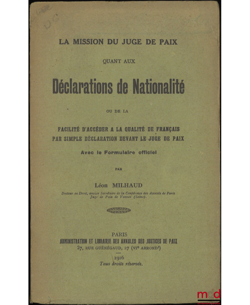 LA MISSION DU JUGE DE PAIX Quant aux déclarations de nationalité ou de la facilité d’accéder à la qualité de français par simple déclaration...