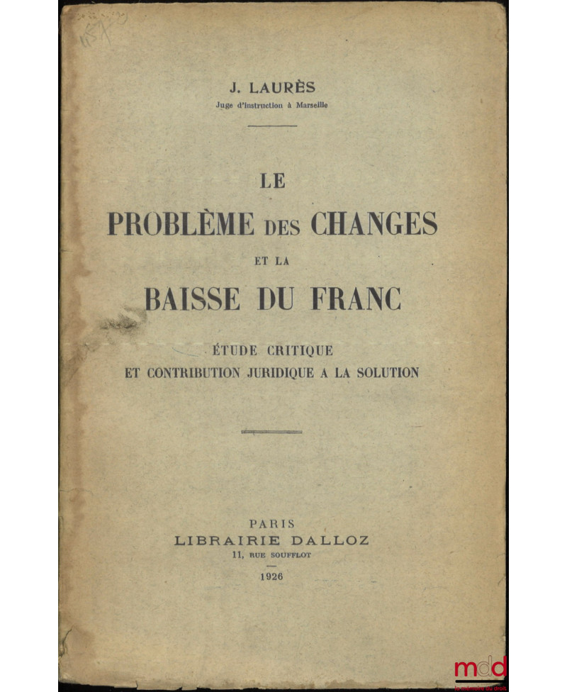 LE PROBLÈME DES CHANGES ET DE LA BAISSE DU FRANC, Étude critique et contribution juridique à la solution