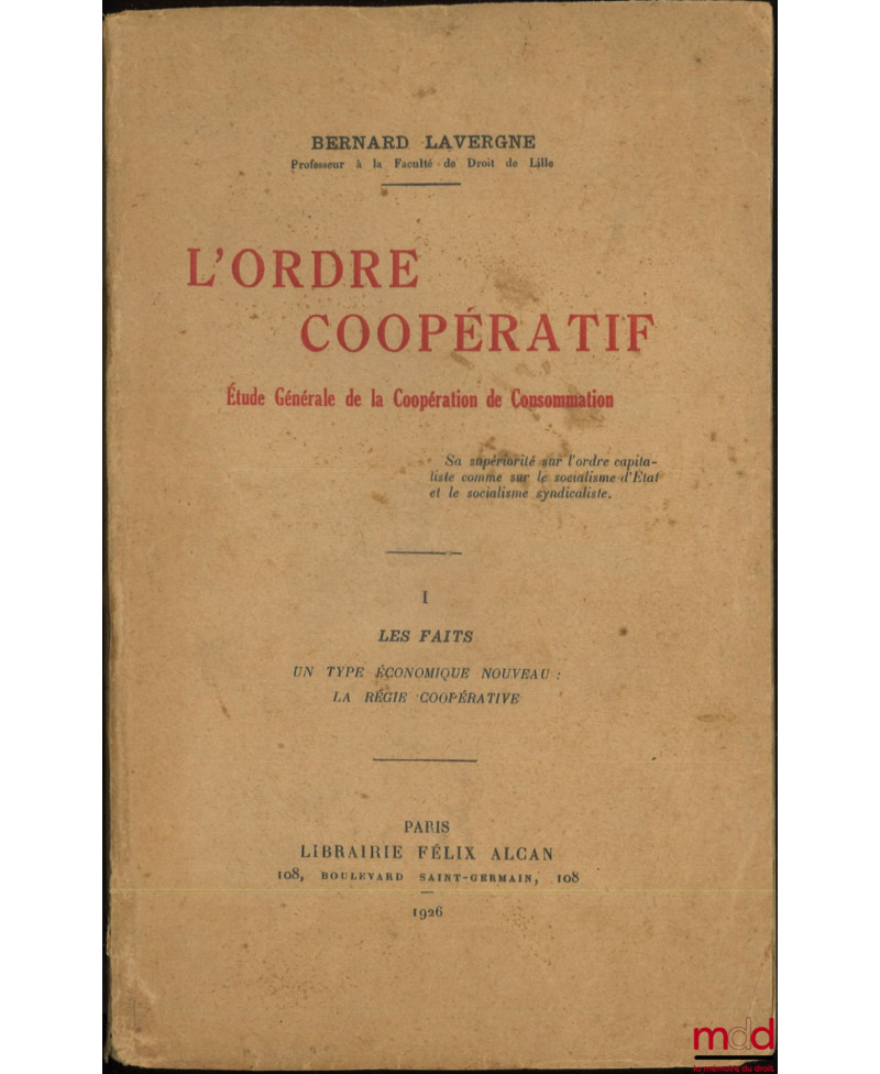 L?ORDRE COOPÉRATIF, Étude Générale de la Coopération de Consommation, t. I [seul] : Les faits, Un type économique nouveau : l...