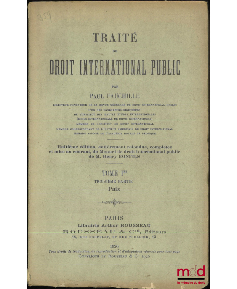 TRAITÉ DE DROIT INTERNATIONAL PUBLIC, 8e éd., entièrement refondue, complétée et mise au courant, du Manuel de droit internat...