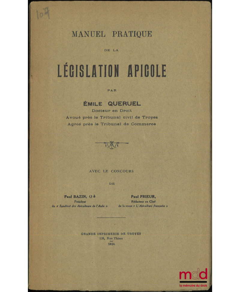 MANUEL PRATIQUE DE LA LÉGISLATION APICOLE, Avec le concours de Paul Bazin et Paul Prieur