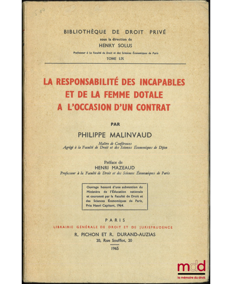 L’AUTOMOBILE EN DROIT PRIVÉ, Études de droit privé sous la direction et avec une Préface de Yvon Loussouarn, Bibl. de droit privé, t. LXIX