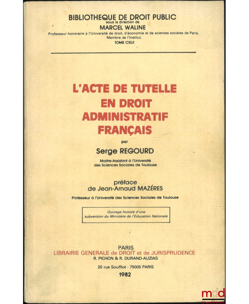 L’ACTE DE TUTELLE EN DROIT ADMINISTRATIF FRANÇAIS, Préface de Jean-Arnaud Mazéres, Bibl. de droit public, t. CXLII