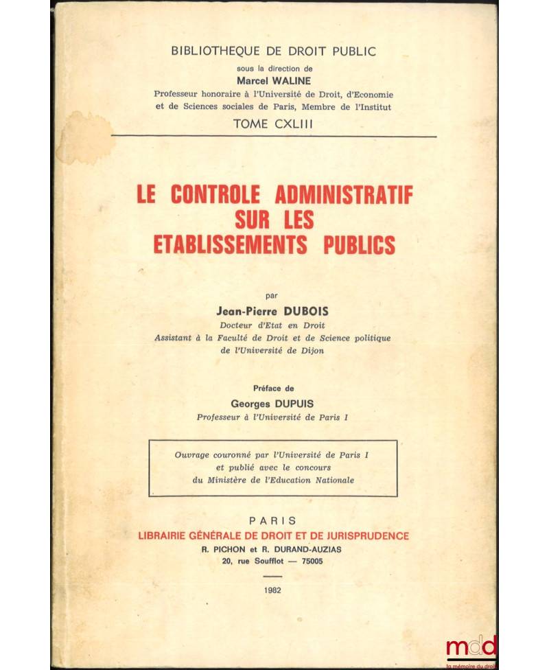 LE CONTRÔLE ADMINISTRATIF SUR LES ÉTABLISSEMENTS PUBLICS, Préface de Georges Dupuis, Bibl. de droit public, t. CXLIII