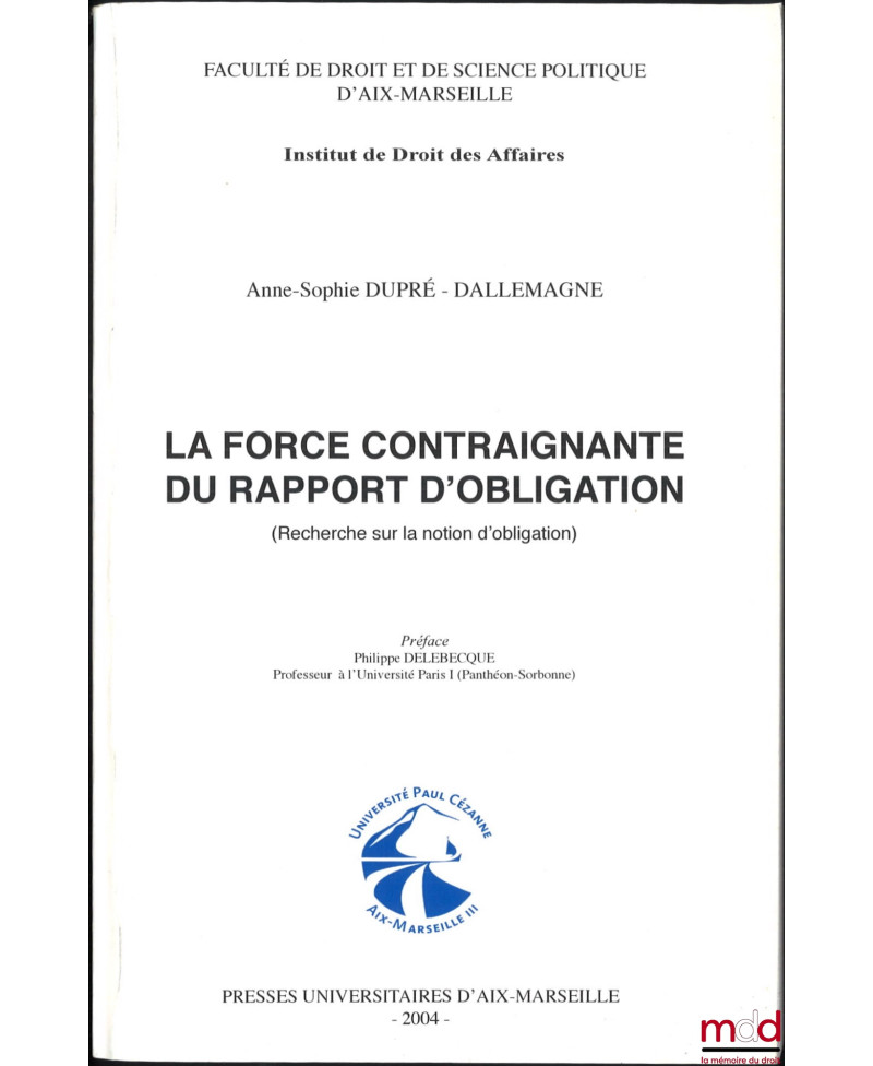 LA FORCE CONTRAIGNANTE DU RAPPORT D’OBLIGATION (Recherche sur la notion d’obligation), Préface de Philippe Delebecque