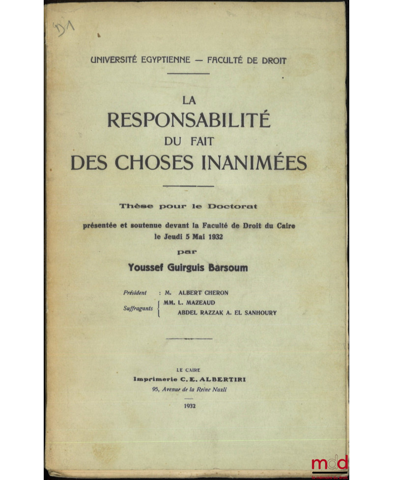 LA RESPONSABILITÉ DU FAIT DES CHOSES INANIMÉES, Thèse, Université Égyptienne - Faculté de droit