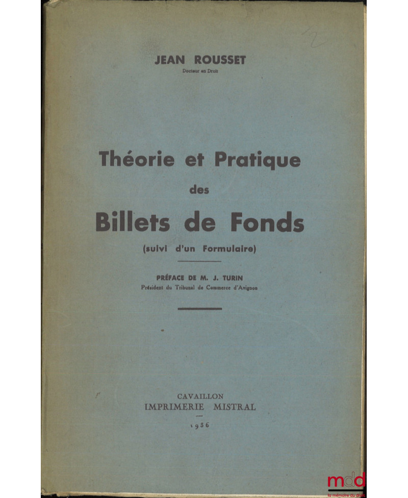 THÉORIE ET PRATIQUE DES BILLETS DE FONDS, (Suivi d’un formulaire), Préface de J. Turin