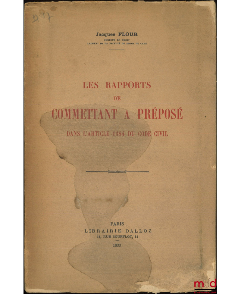 LA RESPONSABILITÉ DES INCAPABLES ET DE LA FEMME DOTALE À L’OCCASION D’UN CONTRAT, Préface de Henri Mazeaud, Bibl. de droit privé, t. LIX