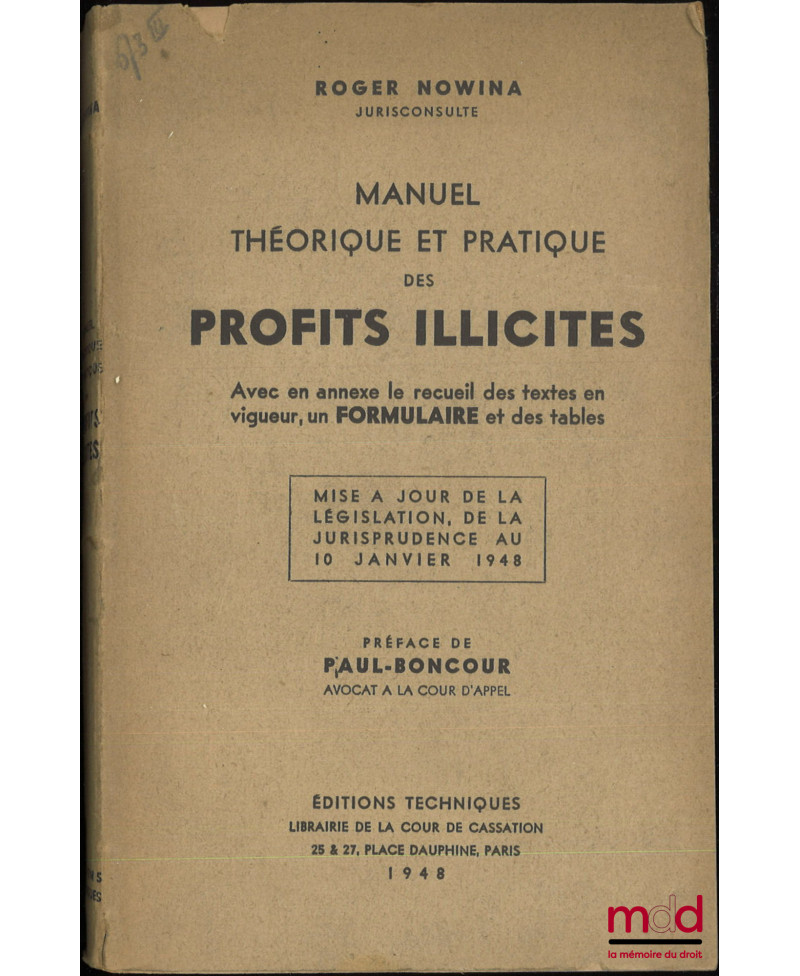MANUEL THÉORIQUE ET PRATIQUE DES PROFITS ILLICITES, Avec en annexe le recueil des textes en vigueur, un Formulaire et des tab...