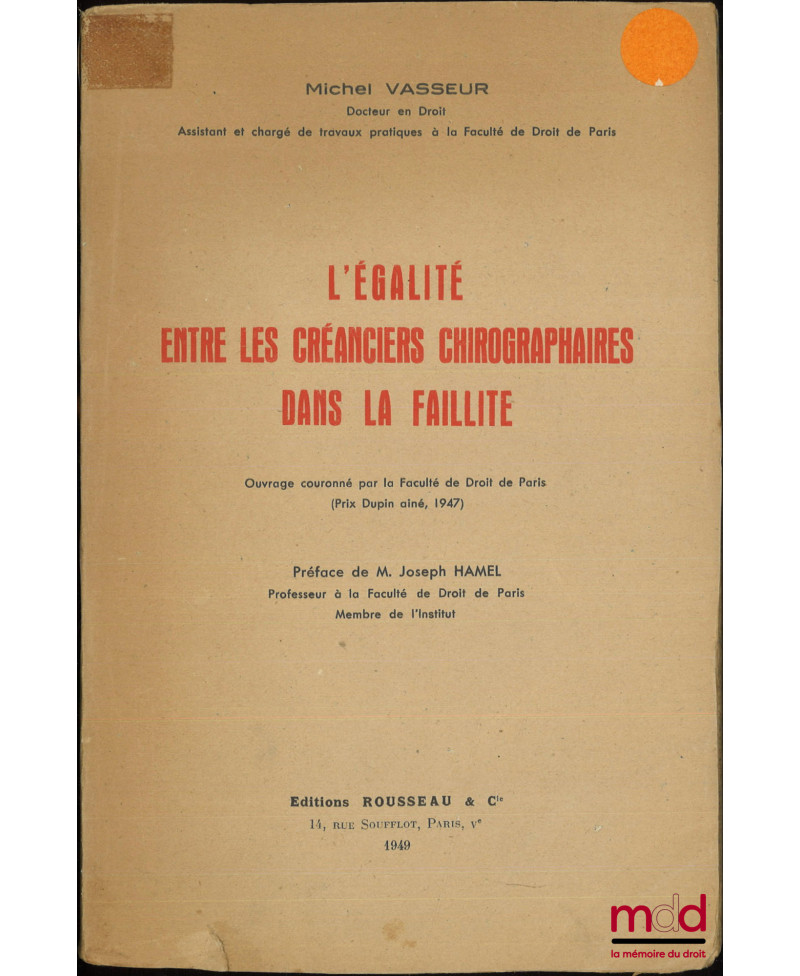 L’ÉGALITÉ ENTRE LES CRÉANCIERS CHIROGRAPHAIRES DANS LA FAILLITE, Préface de Joseph Hamel