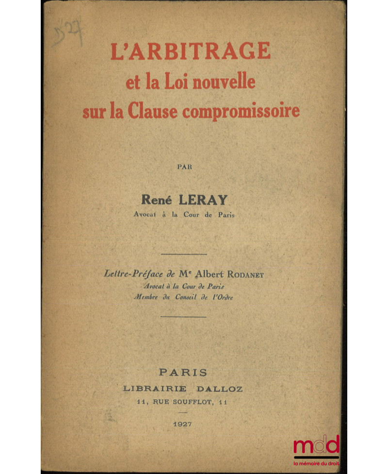 L’ARBITRAGE ET LA LOI NOUVELLE SUR LA CLAUSE COMPROMISSOIRE, Lettre-Préface de Albert Rodanet