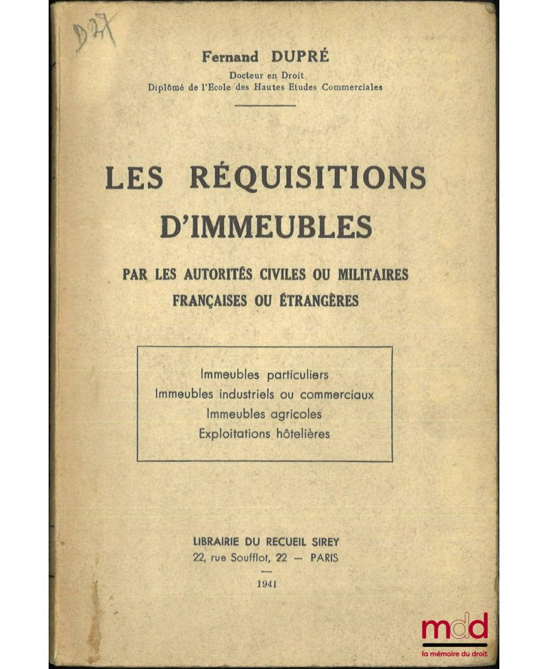 LES RÉQUISITIONS D’IMMEUBLES par les autorités civiles ou militaires françaises ou étrangères, (Immeubles particuliers, Immeubles industriels ou...
