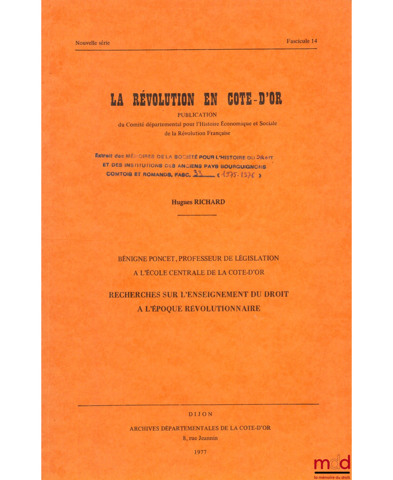 LA RÉVOLUTION EN CÔTÉ D’OR ; BÉNIGNE PONCET, (…) RECHERCHES SUR L’ENSEIGNEMENT DU DROIT À L’ÉPOQUE RÉVOLUTIONNAIRE, extrait des Mémoires de la...