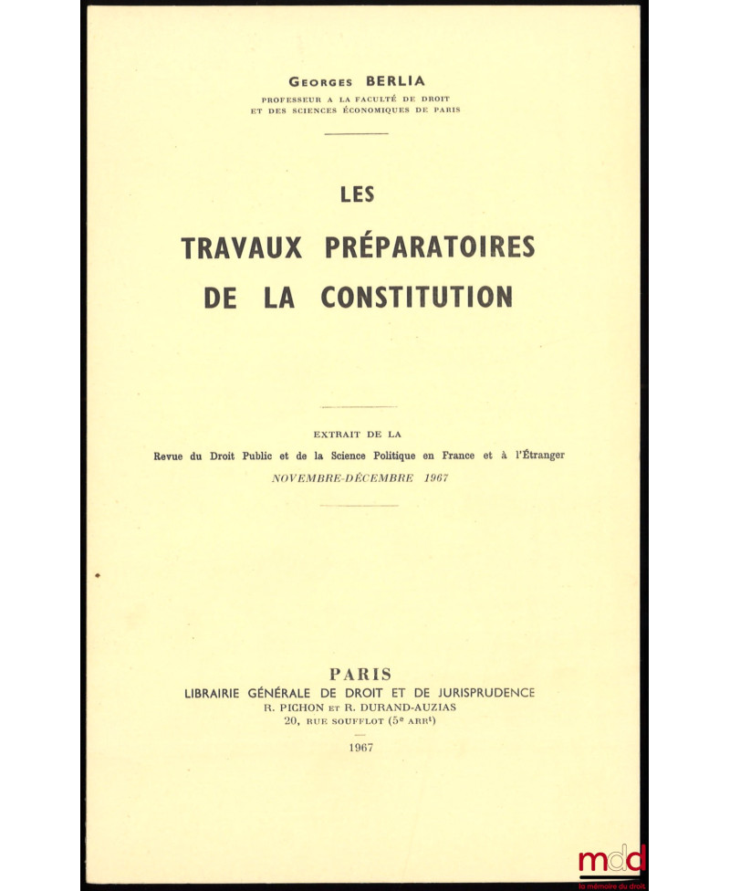 Aperçu Ajouter au panier Ajouter à vos souhaits Comparer Droit moderne (XX-XXIe siècles) BERLIA (Georges) LES TRAVAUX PRÉPARATOIRES DE LA CONSTITUTION, Extrait de la RDP, novembre-décembre 1967 Prix LES TRAVAUX PRÉPARATOIRES DE LA CONSTITUTION, Extrait de la RDP, novembre-décembre 1967