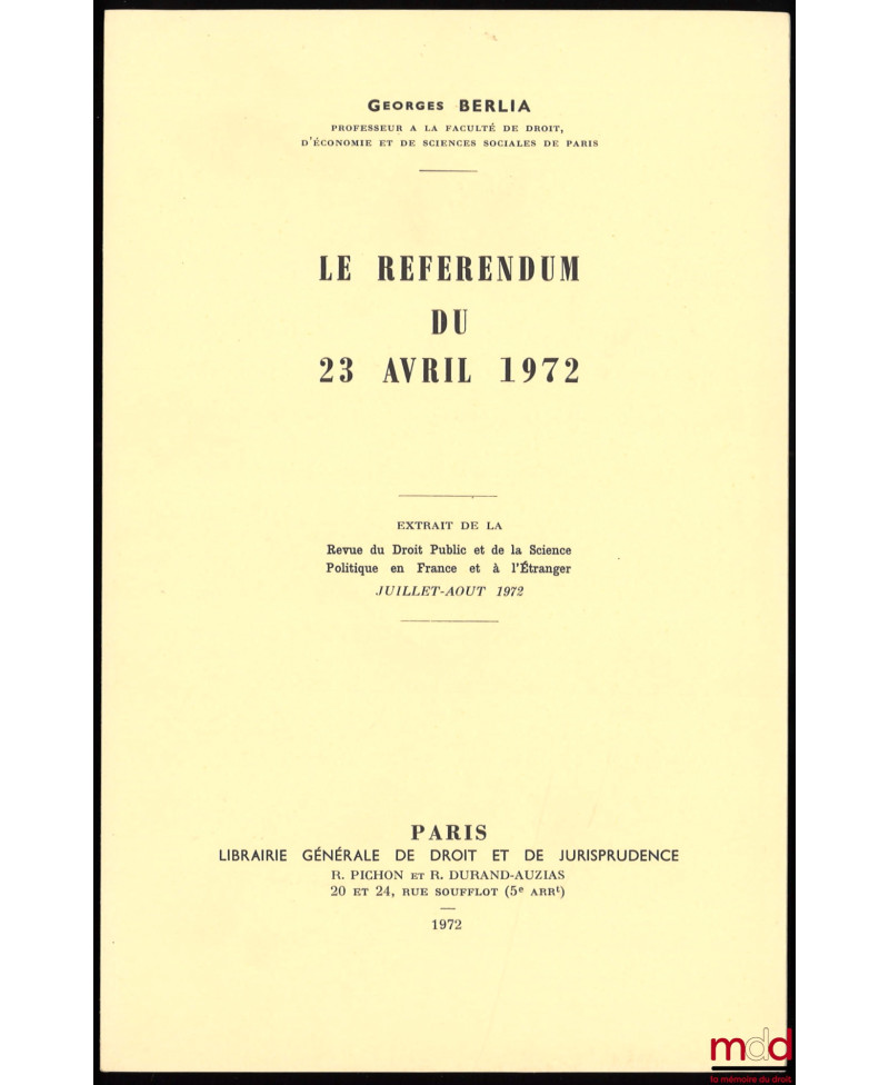 Aperçu Ajouter au panier Ajouter à vos souhaits Comparer Droit moderne (XX-XXIe siècles) BERLIA (Georges) LE RÉFÉRENDUM DU 23 AVRIL 1972, Extrait de la RDP, juillet-août 1972 Prix LE RÉFÉRENDUM DU 23 AVRIL 1972, Extrait de la RDP, juillet-août 1972