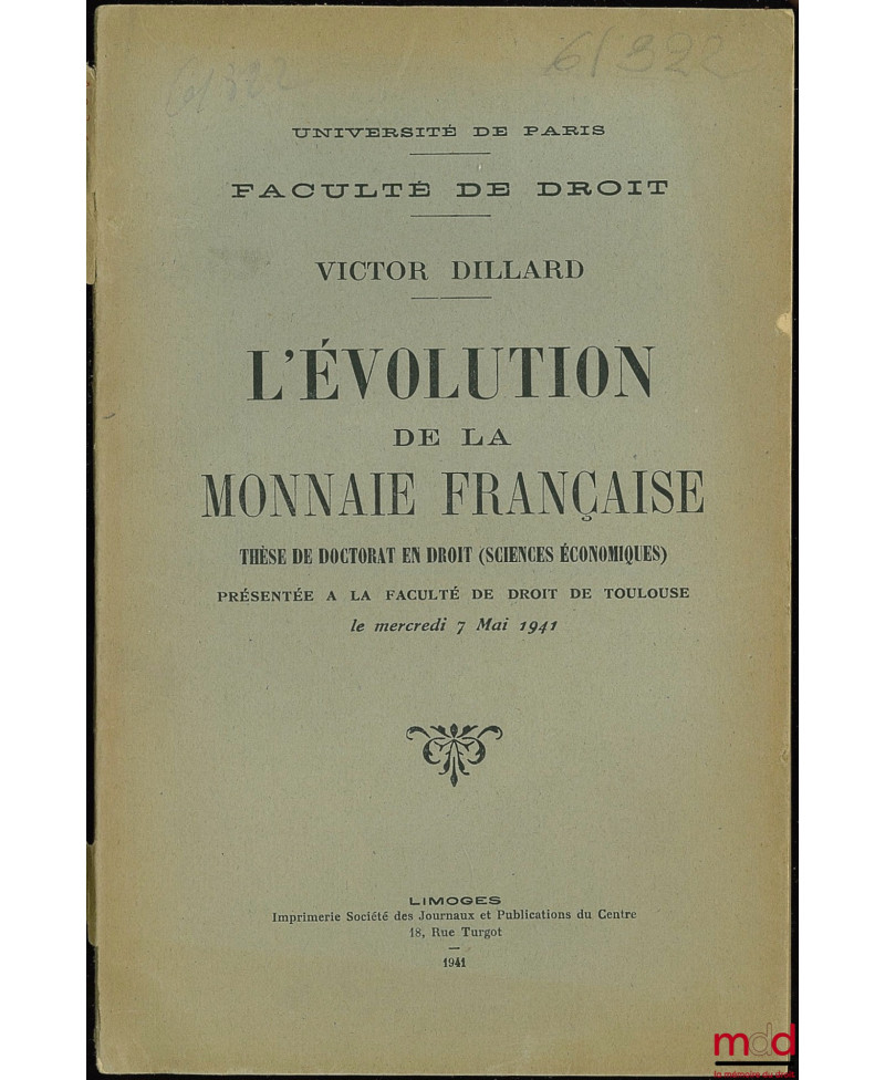 L’ÉVOLUTION DE LA MONNAIE FRANÇAISE, Université de Paris, Faculté de droit
