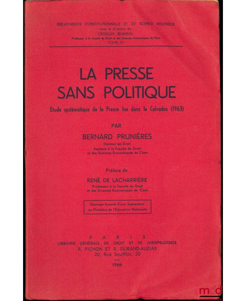 LA PRESSE SANS POLITIQUE, Étude systématique de la Presse lue dans le Calvados (1963), Préface de René de Lacharrière, Bibl. Constitutionnelle et...