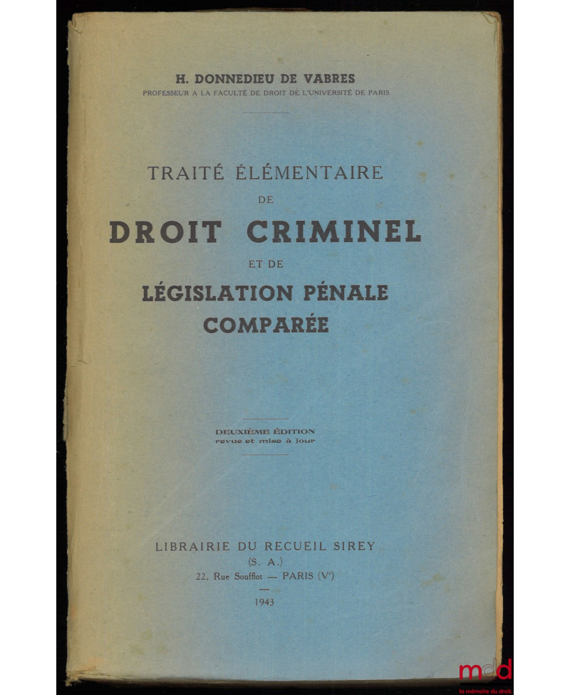 Aperçu Ajouter au panier Ajouter à vos souhaits Comparer Droit moderne (XX-XXIe siècles) DONNEDIEU DE VABRES (Henri) TRAITÉ ÉLÉMENTAIRE DE DROIT CRIMINEL ET DE LÉGISLATION PÉNALE COMPARÉE, 2e éd. revue et mise à jour Prix TRAITÉ ÉLÉMENTAIRE DE DROIT CRIMINEL ET DE LÉGISLATION PÉNALE COMPARÉE, 2e éd. revue et mise à jour