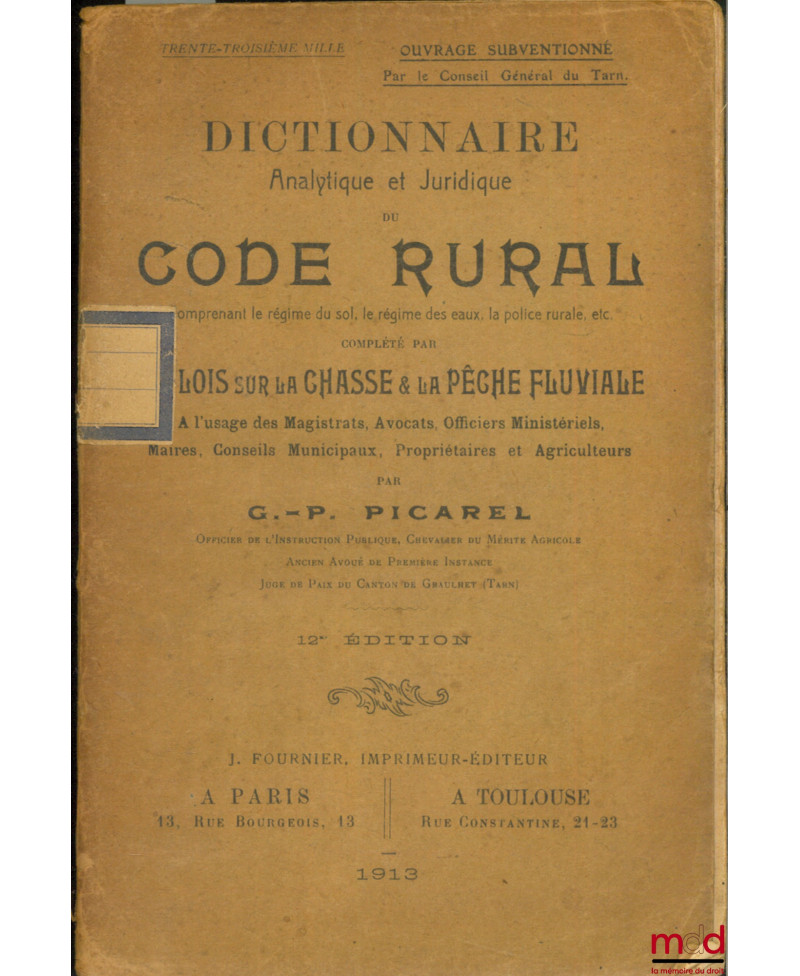 DICTIONNAIRE ANALYTIQUE ET JURIDIQUE DU CODE RURAL comprenant le régime du sol, le régime des eaux, la police rurale, etc., complété par LES LOIS...