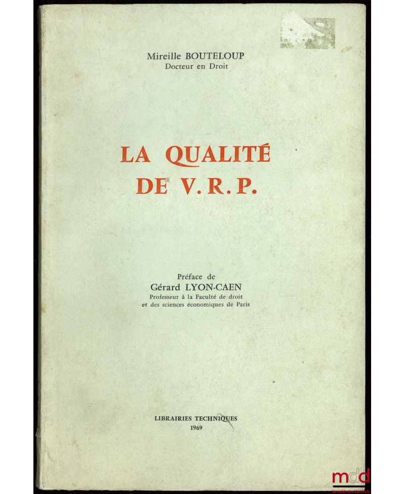 Aperçu Ajouter au panier Ajouter à vos souhaits Comparer Droit moderne (XX-XXIe siècles) BOUTELOUP (Mireille) LA QUALITÉ DE V.R.P., Préface de Gérard Lyon-Caen Prix LA QUALITÉ DE V.R.P., Préface de Gérard Lyon-Caen
