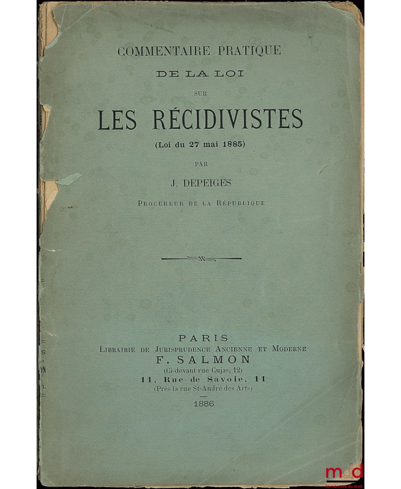Aperçu Ajouter au panier Ajouter à vos souhaits Comparer Droit moderne (XX-XXIe siècles) DESPEIGES (J.) COMMENTAIRE PRATIQUE DE LA LOI SUR LES RÉCIDIVISTES (Loi du 27 mai 1885) Prix COMMENTAIRE PRATIQUE DE LA LOI SUR LES RÉCIDIVISTES (Loi du 27 mai 1885)