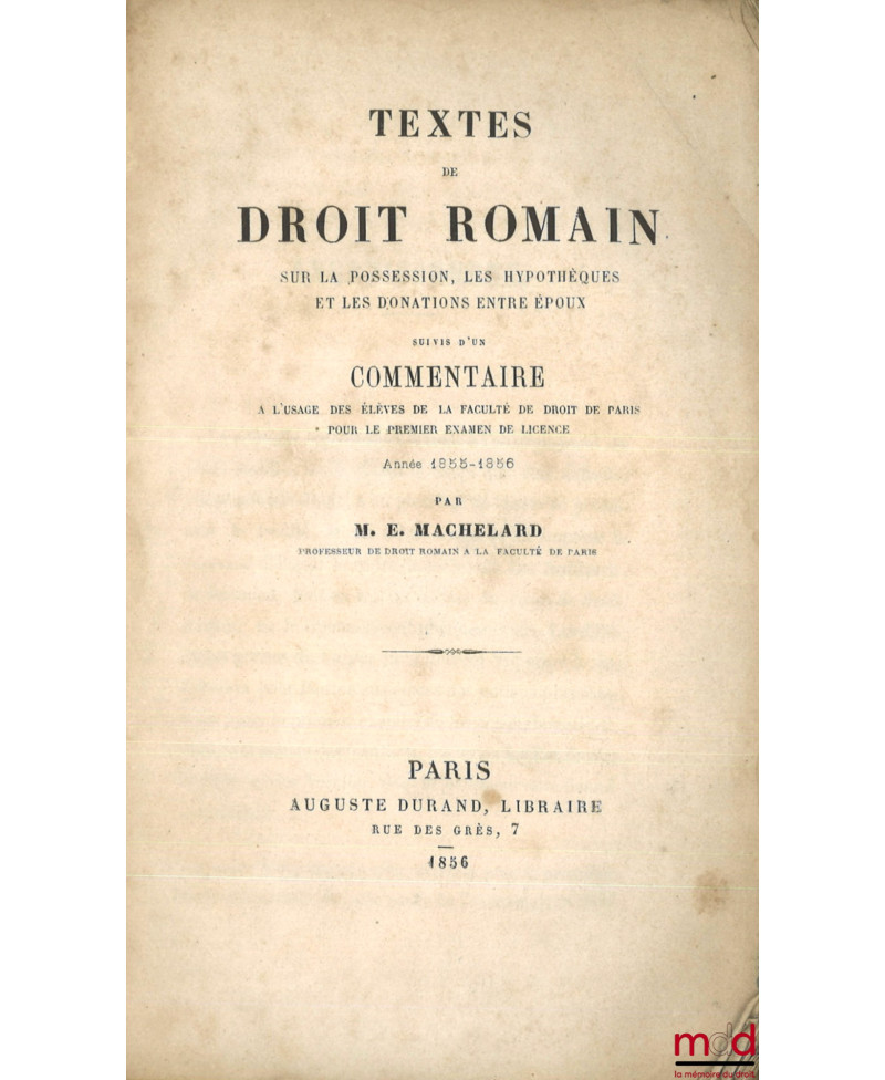 TEXTES DE DROIT ROMAIN SUR LA POSSESSION, LES HYPOTHÈQUES ET LES DONATIONS ENTRE ÉPOUX, SUIVI D’UN COMMENTAIRE À L’USAGE DES ÉLÈVES DE LA FACULTÉ...