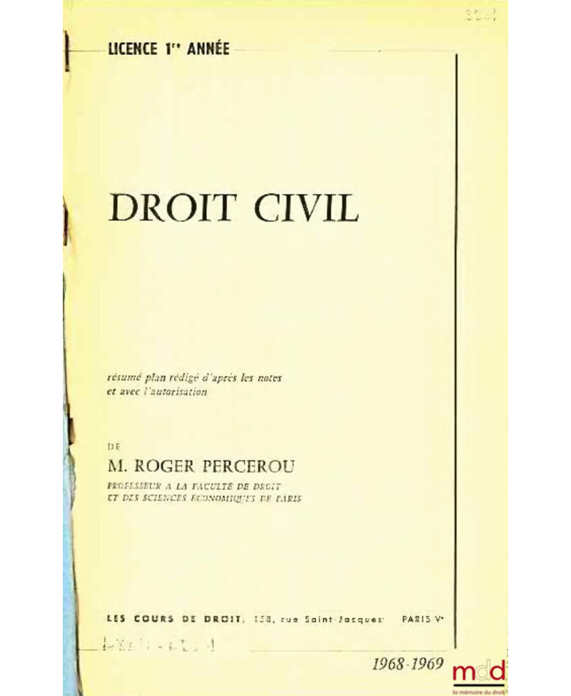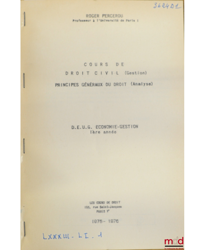 COURS DE DROIT CIVIL (Gestion) - PRINCIPES GÉNÉRAUX DU DROIT (Analyse), D.E.U.G. Économie-Gestion 1ère année, 1975-1976