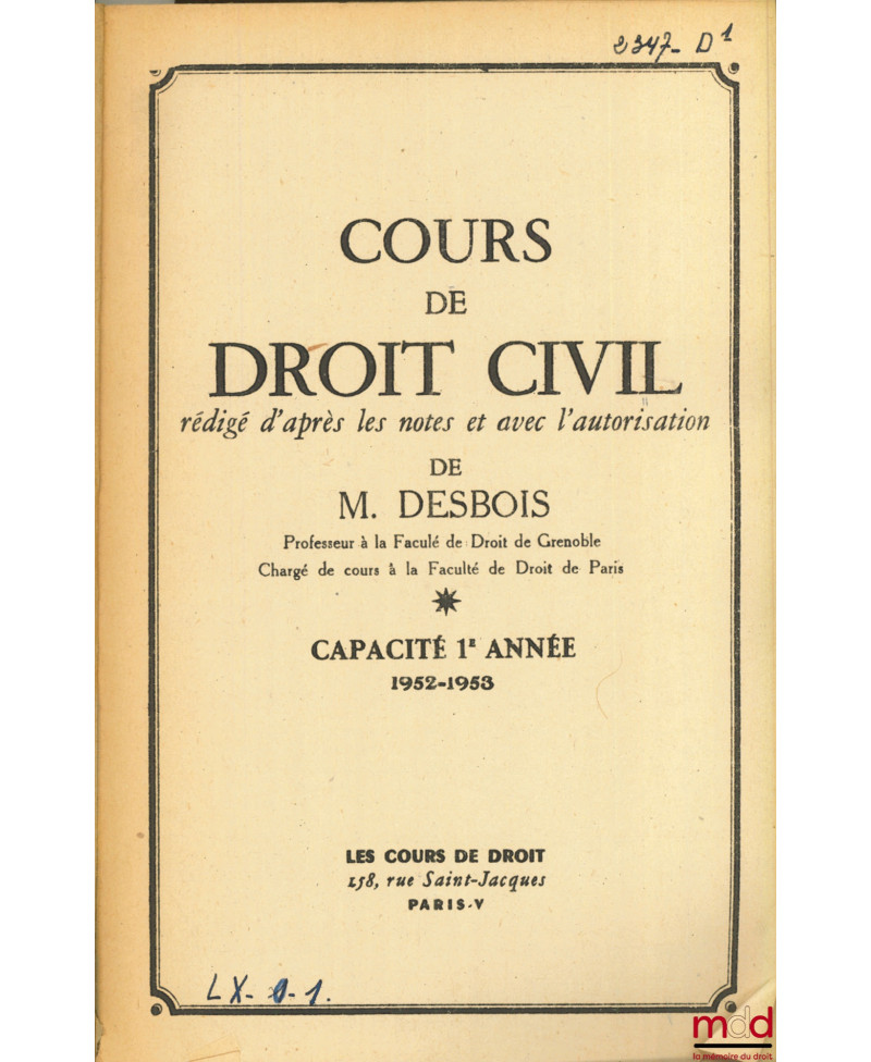 Aperçu Ajouter au panier Ajouter à vos souhaits Comparer Droit moderne (XX-XXIe siècles) DESBOIS (Henri) COURS DE DROIT CIVIL, Capacité 1ère année, 1952-1953 Prix COURS DE DROIT CIVIL, Capacité 1ère année, 1952-1953