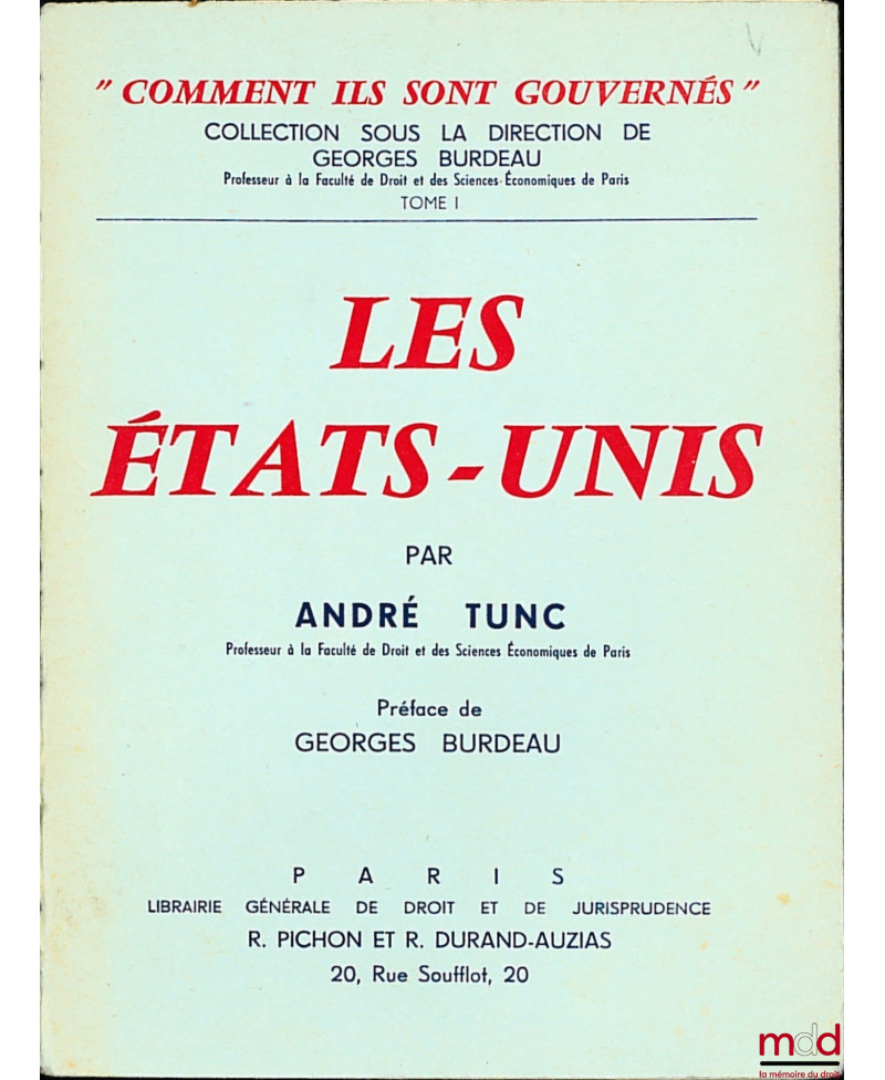 Aperçu Ajouter au panier Ajouter à vos souhaits Comparer Droit moderne (XX-XXIe siècles) TUNC (André) LES ÉTATS-UNIS, Préface de Georges Burdeau, 3ème éd., coll. ?comment ils sont gouvernés?, sous la direction de Georges Burdea... Prix LES ÉTATS-UNIS, Préface de Georges Burdeau, 3ème éd., coll. “comment ils sont gouvernés”, sous la direction de Georges Burdeau, t. I