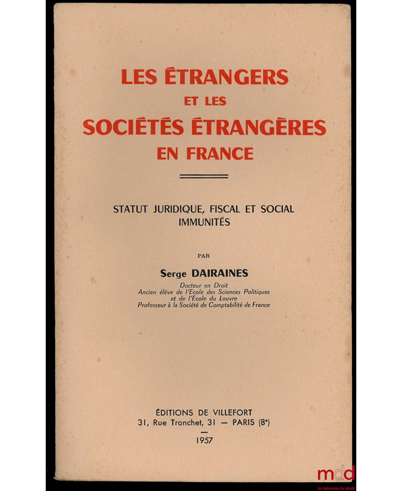 LES ÉTRANGERS ET LES SOCIÉTÉS ÉTRANGÈRES EN FRANCE. Statut juridique, fiscal et social. Immunités