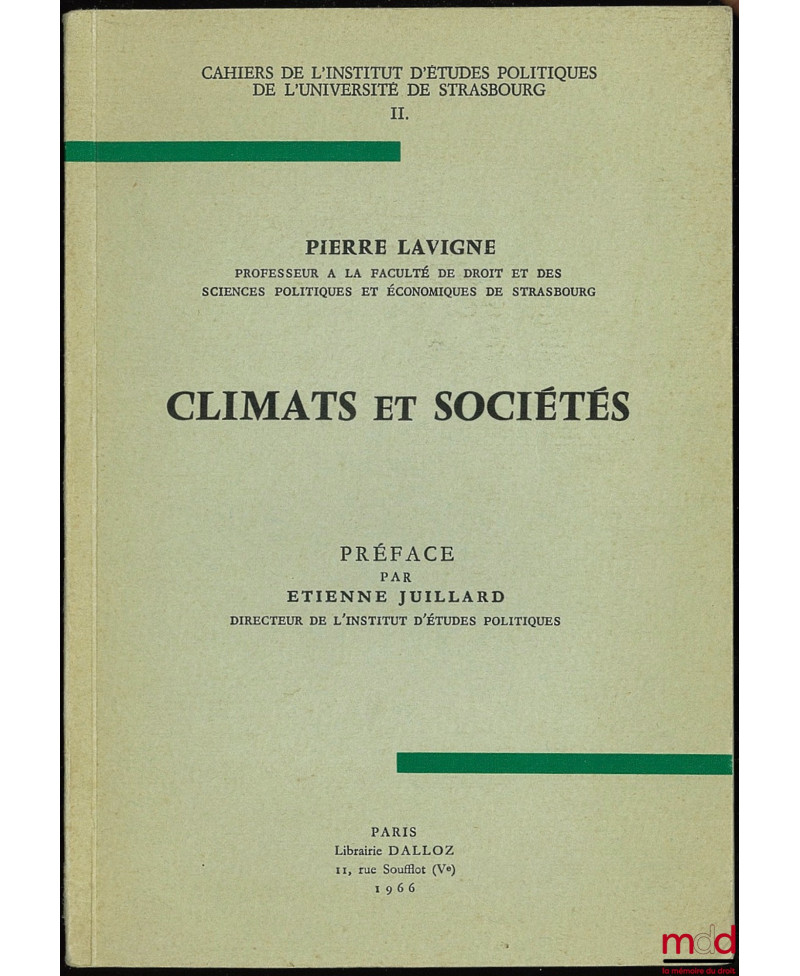 CLIMATS ET SOCIÉTÉS, coll. Cahiers de l’I.E.P. de l’Université de Strasbourg, t. II, Préface de Étienne Juillard