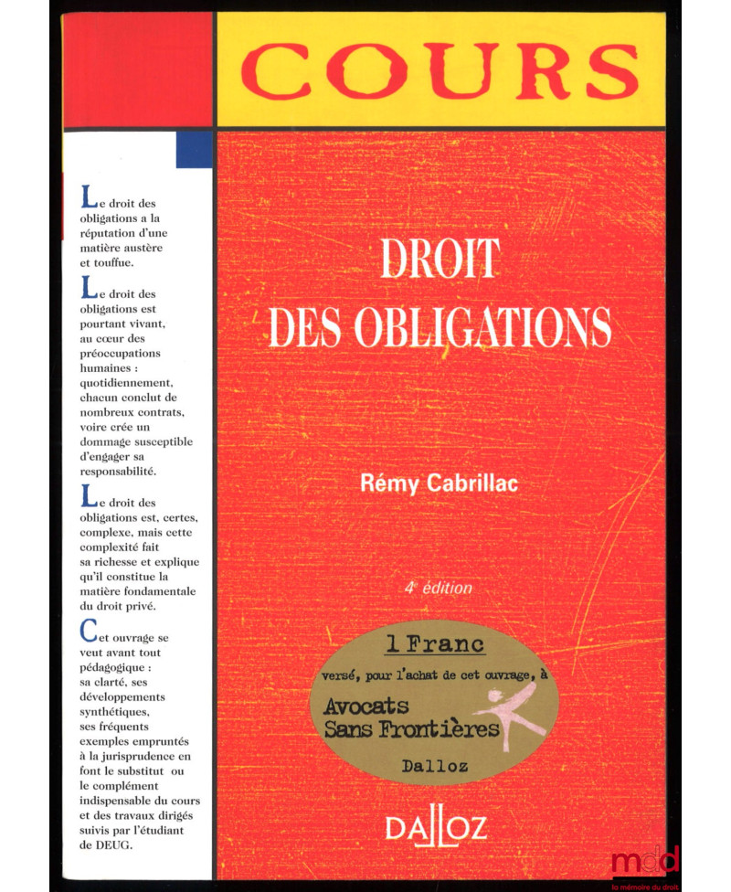 Aperçu Ajouter au panier Ajouter à vos souhaits Comparer Droit moderne (XX-XXIe siècles) CABRILLAC (Rémy) DROIT DES OBLIGATIONS, 4e éd., coll. Cours Dalloz Série droit privé Prix DROIT DES OBLIGATIONS, 4e éd., coll. Cours Dalloz Série droit privé