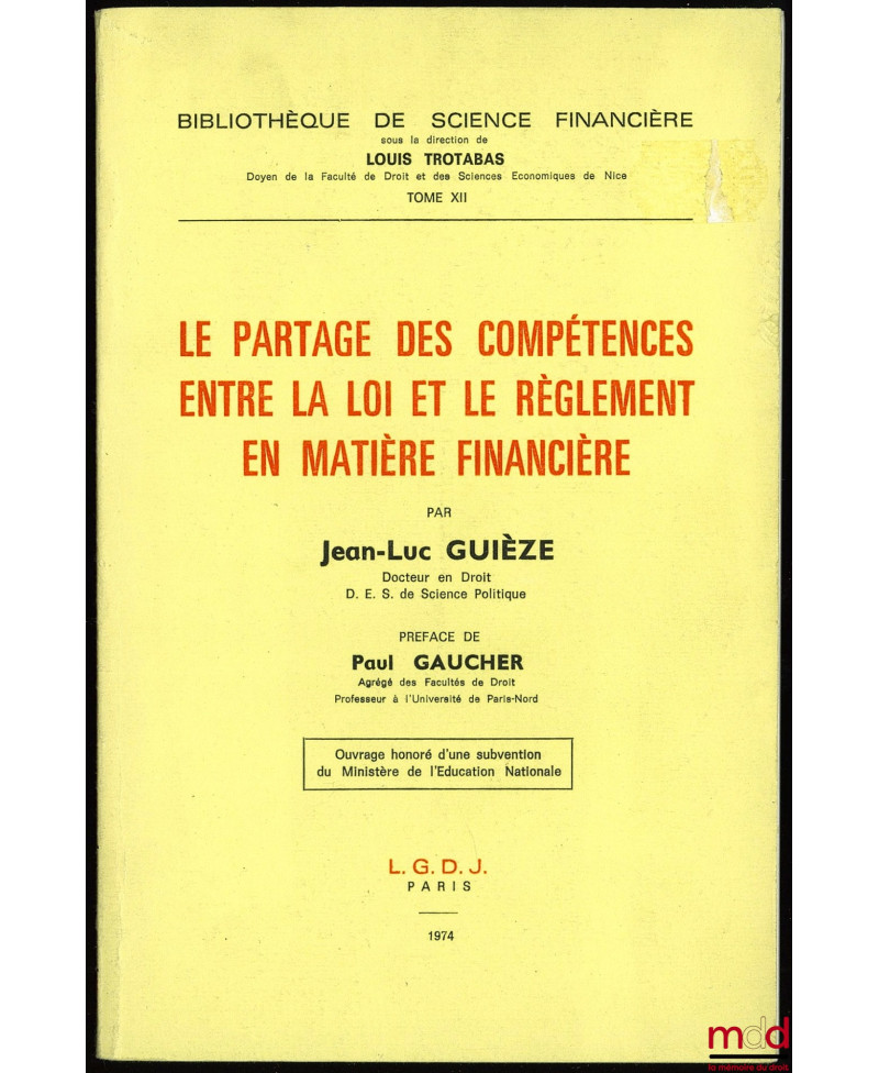 LE PARTAGE DES COMPÉTENCES ENTRE LA LOI ET LE RÈGLEMENT EN MATIÈRE FINANCIÈRE, Préface de Paul Gaucher, Bibl. de science financière, t. XII