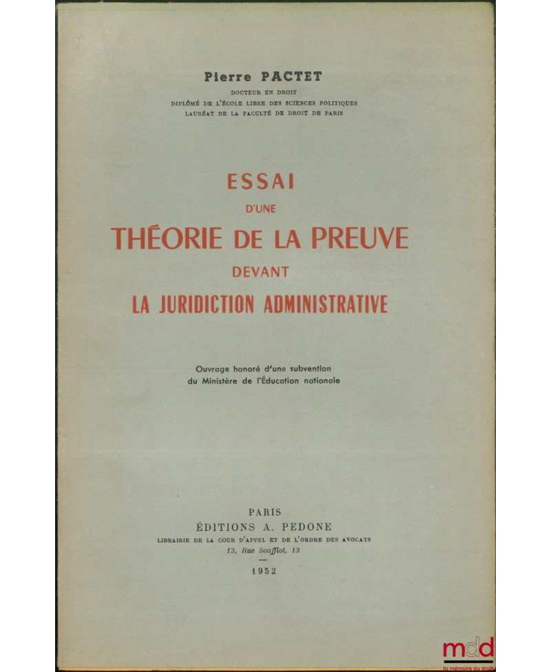 ESSAI D’UNE THÉORIE DE LA PREUVE DEVANT LA JURIDICTION ADMINISTRATIVE, Thèse (Président : M. Rousseau ; Suffragants : Vedel et Eisenmann)