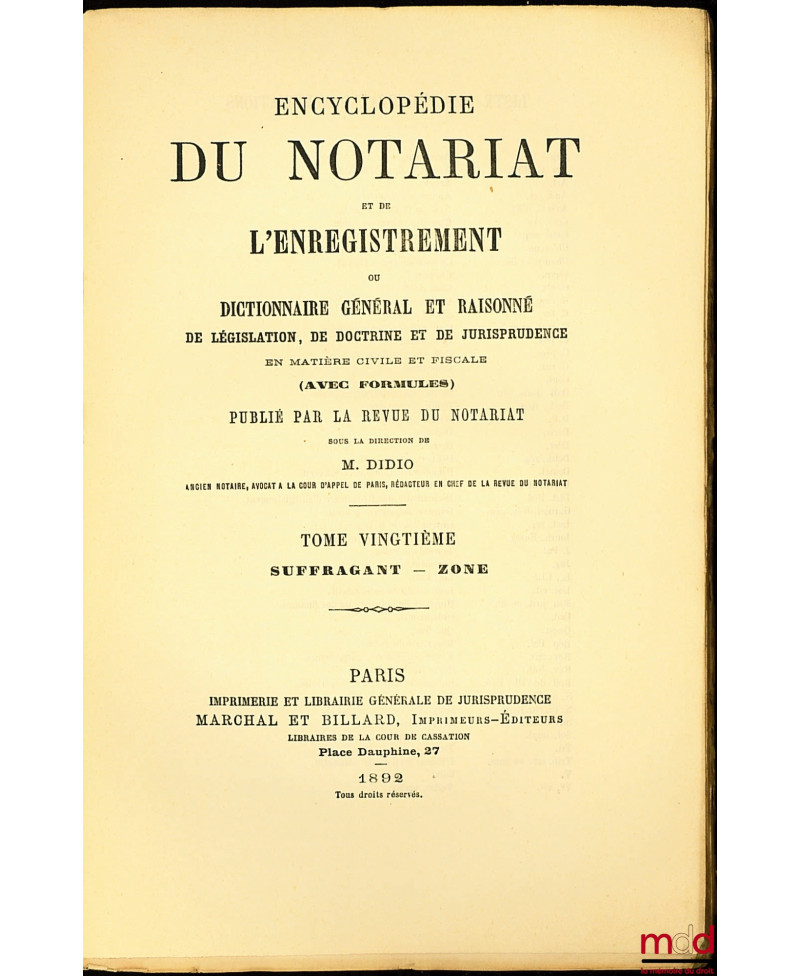 ENCYCLOPÉDIE DU NOTARIAT ET DE L’ENREGISTREMENT OU DICTIONNAIRE GÉNÉRAL ET RAISONNÉ DE LÉGISLATION, DE DOCTRINE ET DE JURISPRUDENCE EN MATIÈRE...