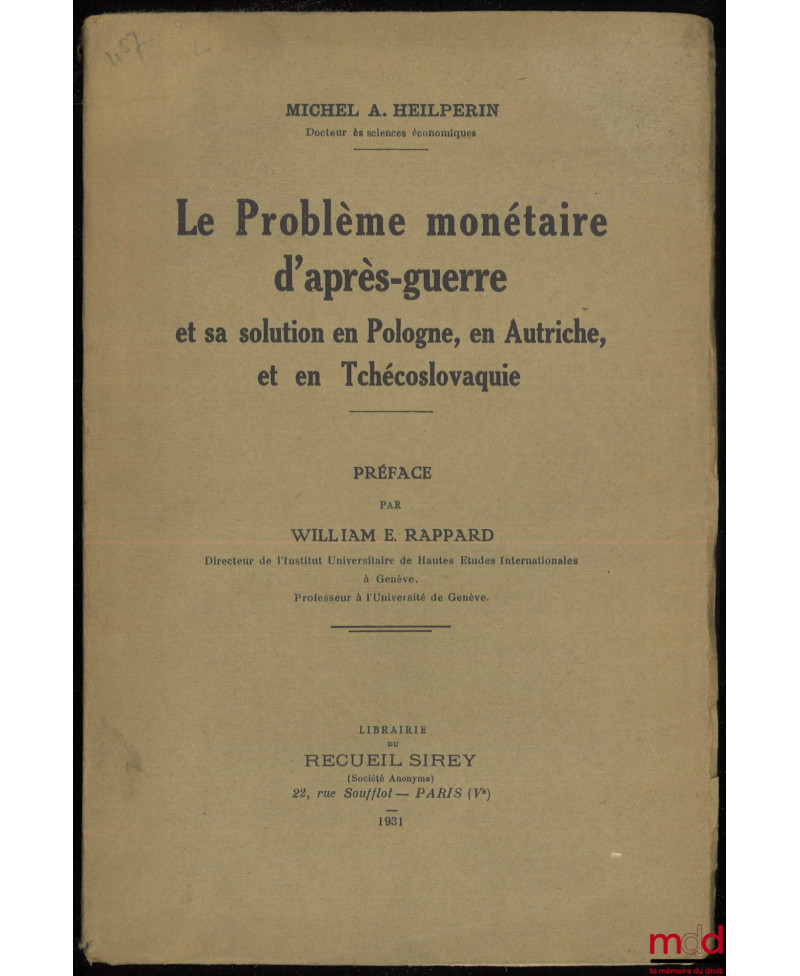 LE PROBLÈME MONÉTAIRE D’APRÈS-GUERRE et sa solution en Pologne, en Autriche et en Tchécoslovaquie, Préface de William E. Rappard