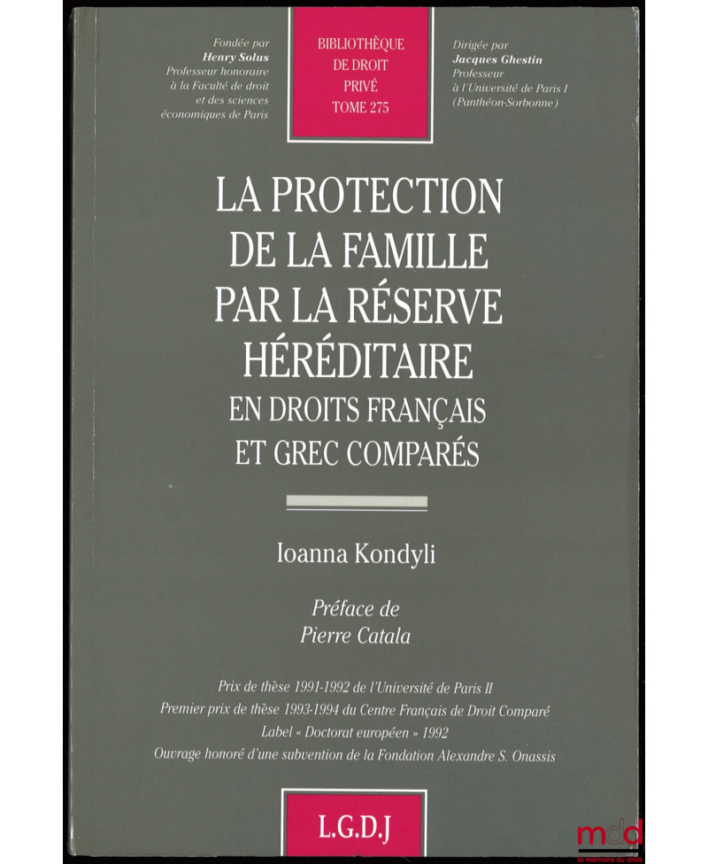 LA PROTECTION DE LA FAMILLE PAR LA RÉSERVE HÉRÉDITAIRE EN DROITS FRANÇAIS ET GRECS COMPARÉS, Préface de Pierre Catala, Avant-...