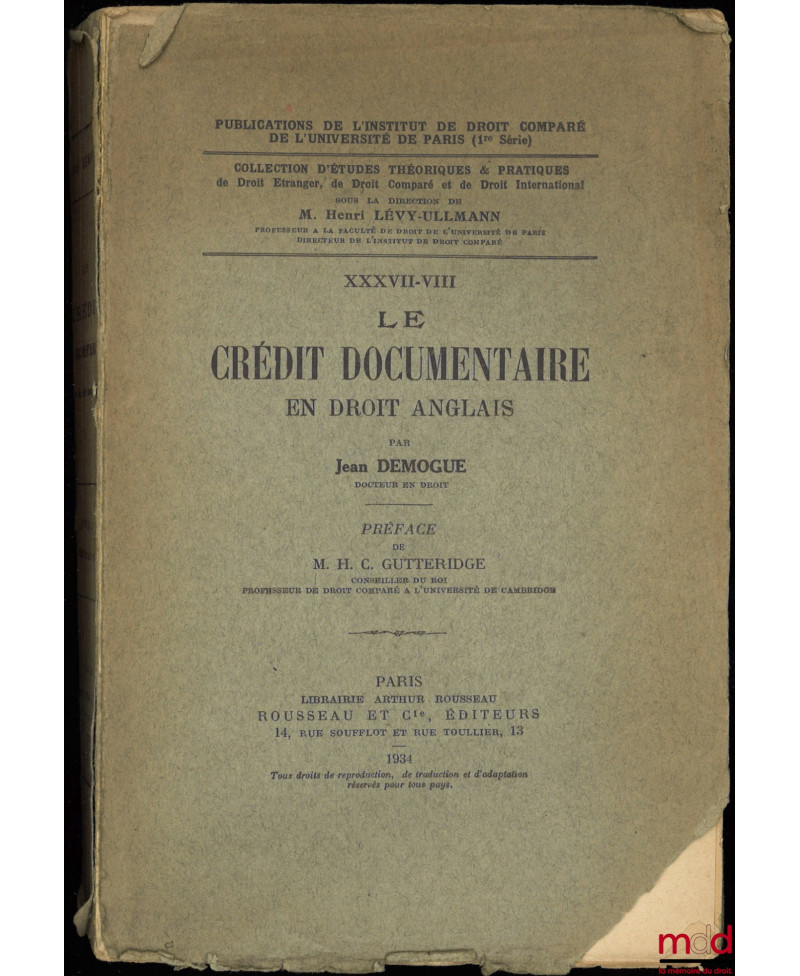 LE CRÉDIT DOCUMENTAIRE EN DROIT ANGLAIS, Préface de M. H. C. Guitteridge, Publications de l’Institut de droit comparé de l’Université de Paris,...