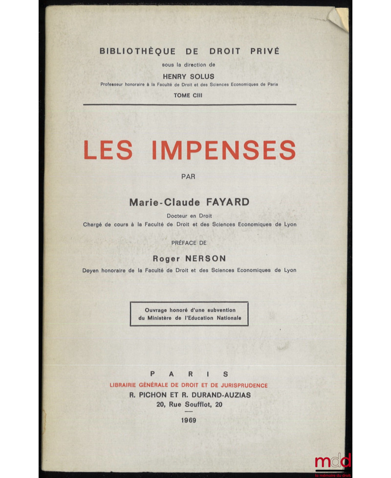 Aperçu Ajouter au panier Ajouter à vos souhaits Comparer Droit moderne (XX-XXIe siècles) FAYARD (Marie-Claude) LES IMPENSES, Préface de Roger Nerson, Bibl. de droit privé, t. CIII Prix LES IMPENSES, Préface de Roger Nerson, Bibl. de droit privé, t. CIII