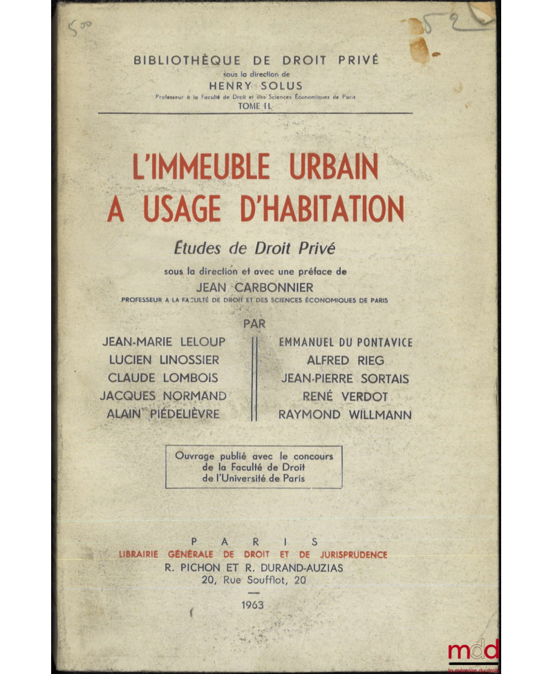 L?IMMEUBLE URBAIN À USAGE D?HABITATION, Études de Droit privé sous la direction et avec une Préface de Jean CARBONNIER, col. ...