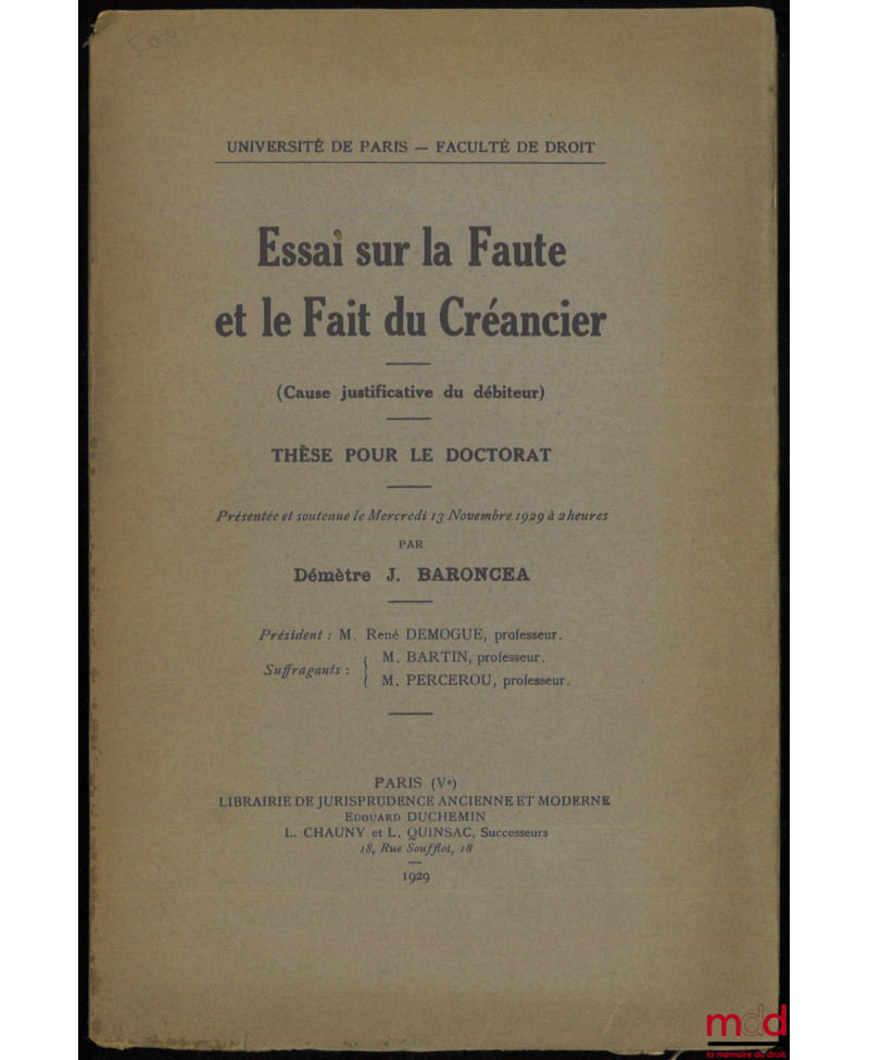 ESSAI SUR LA FAUTE ET LE FAIT DU CRÉANCIER (Cause justificative du débiteur en matière contractuelle)