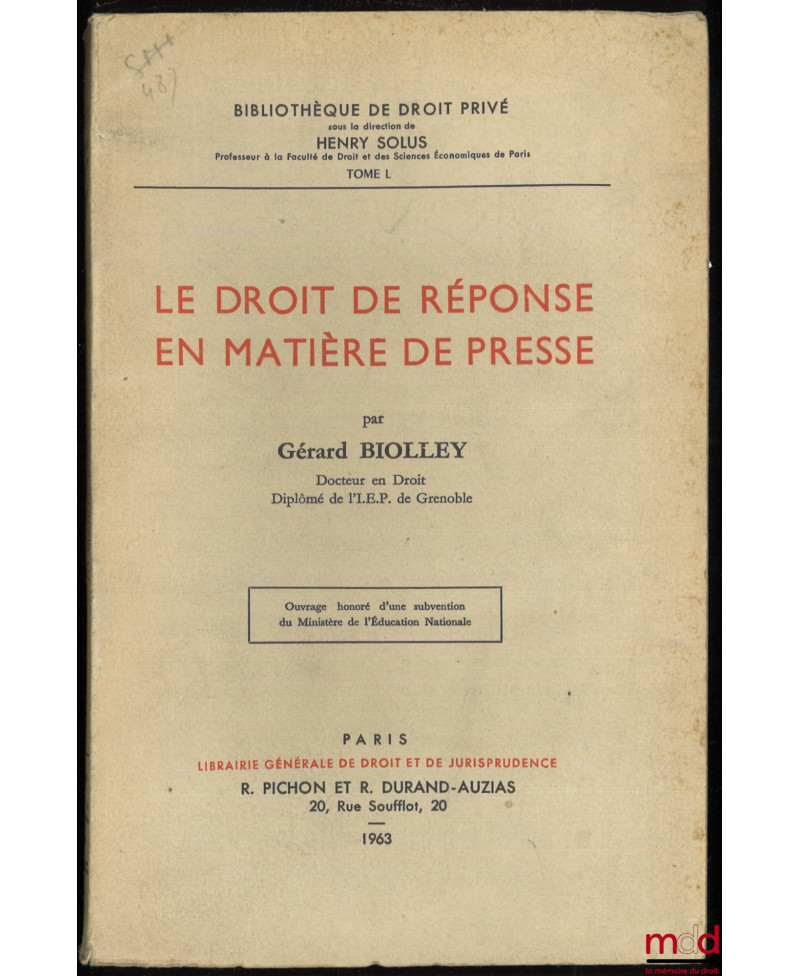 Aperçu Ajouter au panier Ajouter à vos souhaits Comparer Droit moderne (XX-XXIe siècles) BIOLLEY (Gérard) LE DROIT DE RÉPONSE EN MATIÈRE DE PRESSE, Bibl. de droit privé, t. L Prix LE DROIT DE RÉPONSE EN MATIÈRE DE PRESSE, Bibl. de droit privé, t. L