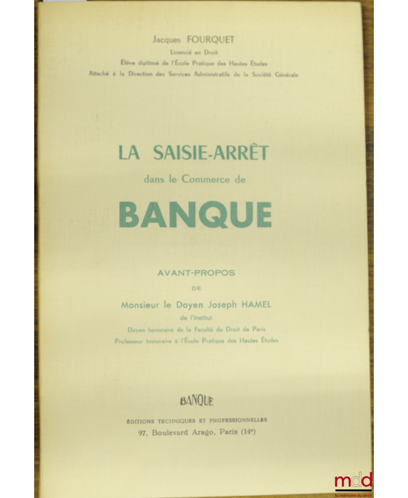 LA SAISIE-ARRÊT DANS LE COMMERCE DE BANQUE, Avant-propos de M. le Doyen Joseph Hamel