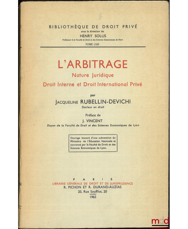 L?ARBITRAGE, NATURE JURIDIQUE, DROIT INTERNE ET DROIT INTERNATIONAL PRIVÉ, Préface de Jean Vincent, Bibl. de droit privé, t. ...