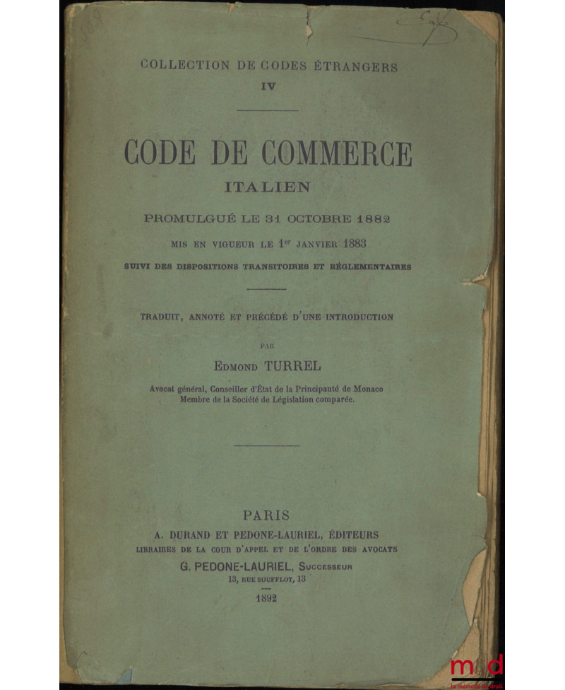 CODE DE COMMERCE ITALIEN Promulgué le 31 octobre 1882, Mis en vigueur le 1er janvier 1883 suivi des dispositions transitoires...