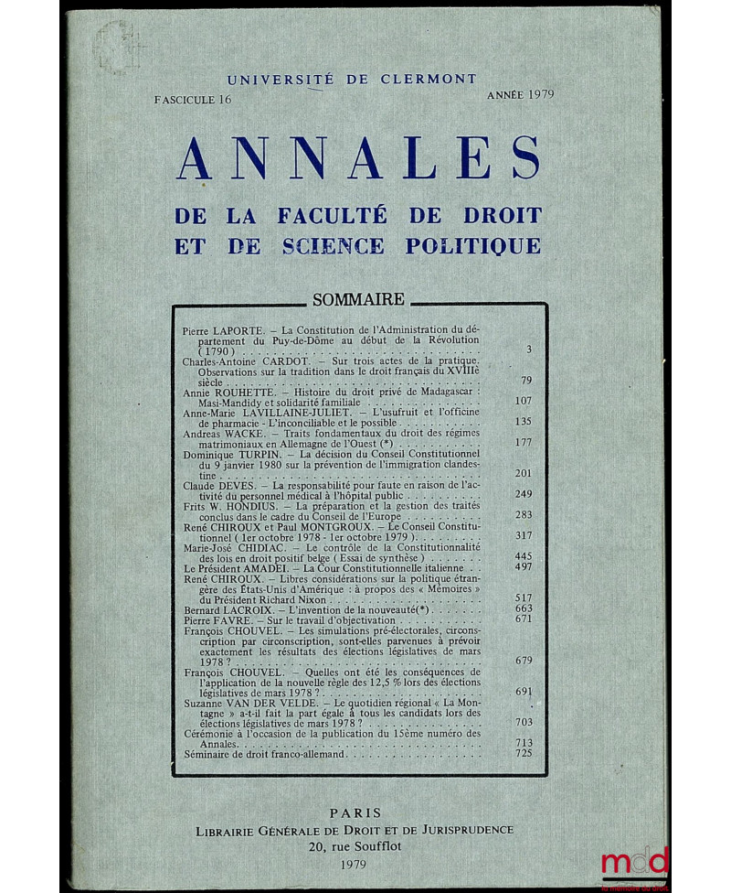 LA CONSTITUTION DE L’ADMINISTRATION DU DÉPARTEMENT DU PUY-DE-DÔME AU DÉBUT DE LA RÉVOLUTION (1790), extrait des Annales de l’Université Clermont,...