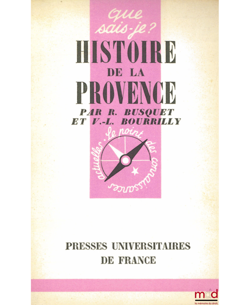 Aperçu Ajouter au panier Ajouter à vos souhaits Comparer Droit moderne (XX-XXIe siècles) BUSQUET (R.) et BOURRILLY (V.-L.) HISTOIRE DE LA PROVENCE, 3ème éd., coll. Que sais-je ? Prix HISTOIRE DE LA PROVENCE, 3ème éd., coll. Que sais-je ?