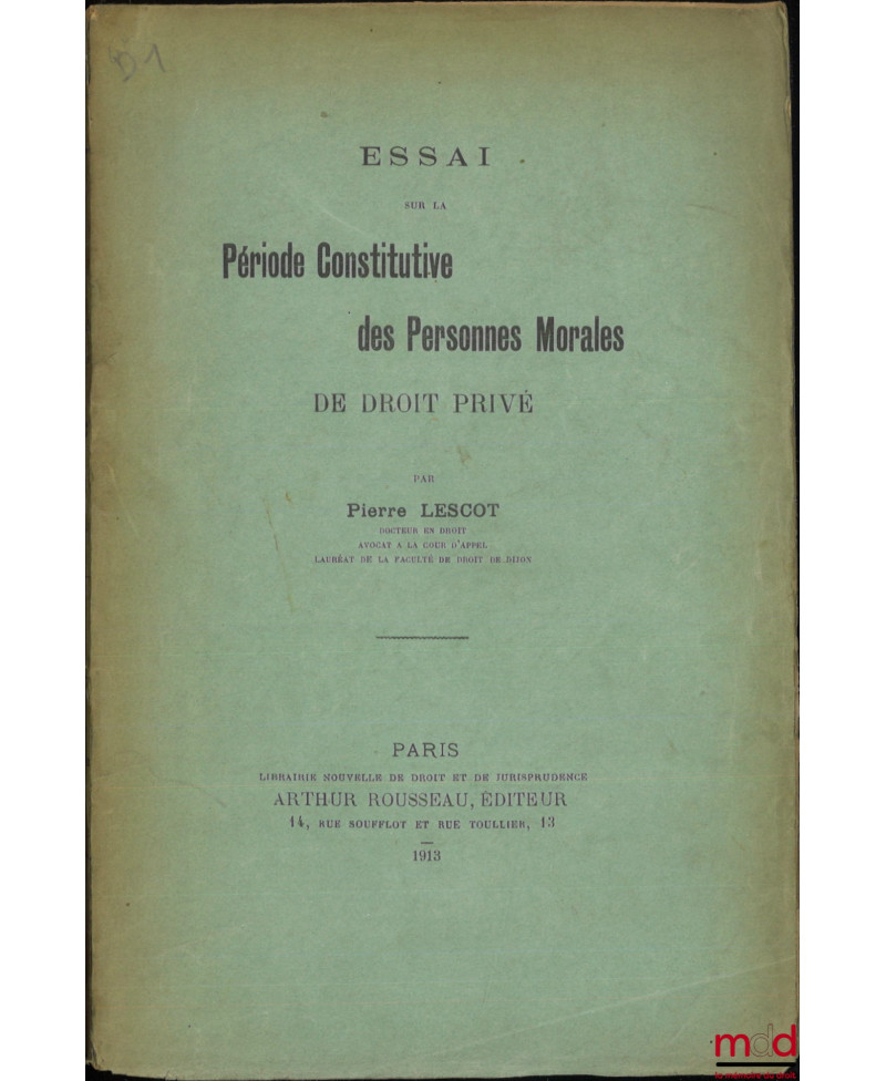 Nouvelle acquisition Aperçu Ajouter au panier Ajouter à vos souhaits Comparer Droit moderne (XX-XXIe siècles) LESCOT (Pierre) ESSAI SUR LA PÉRIODE CONSTITUTIVE DES PERSONNES MORALES DE DROIT PRIVÉ Prix ESSAI SUR LA PÉRIODE CONSTITUTIVE DES PERSONNES MORALES DE DROIT PRIVÉ